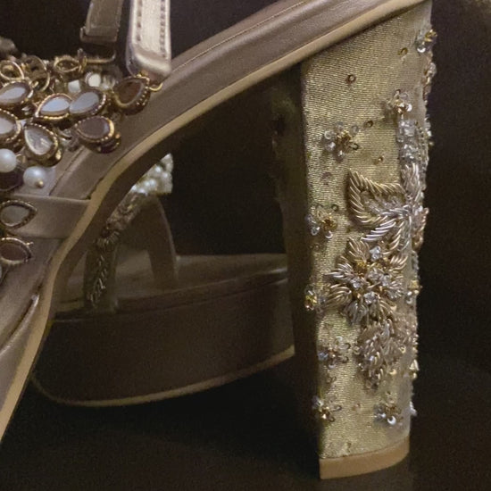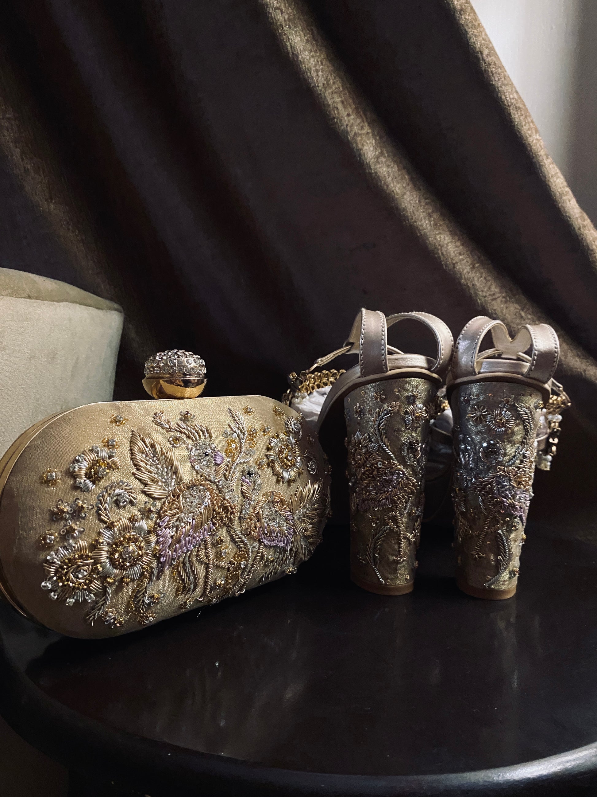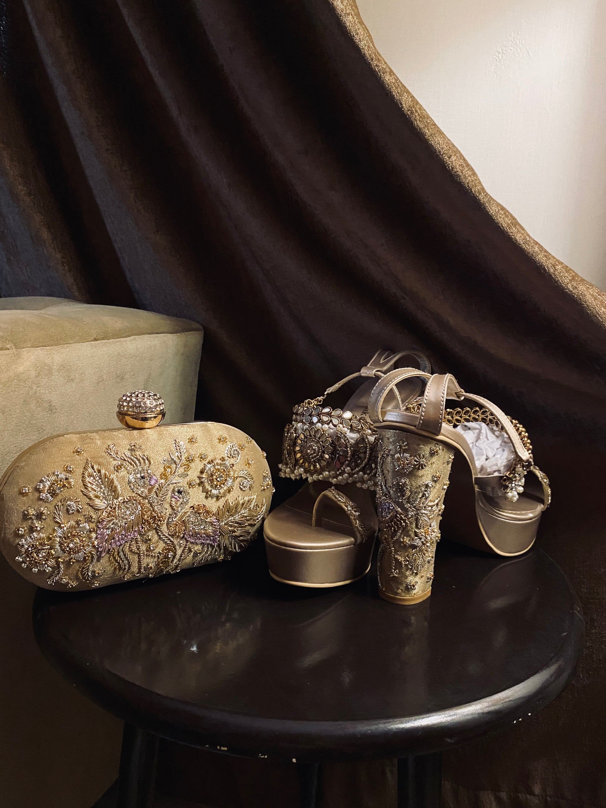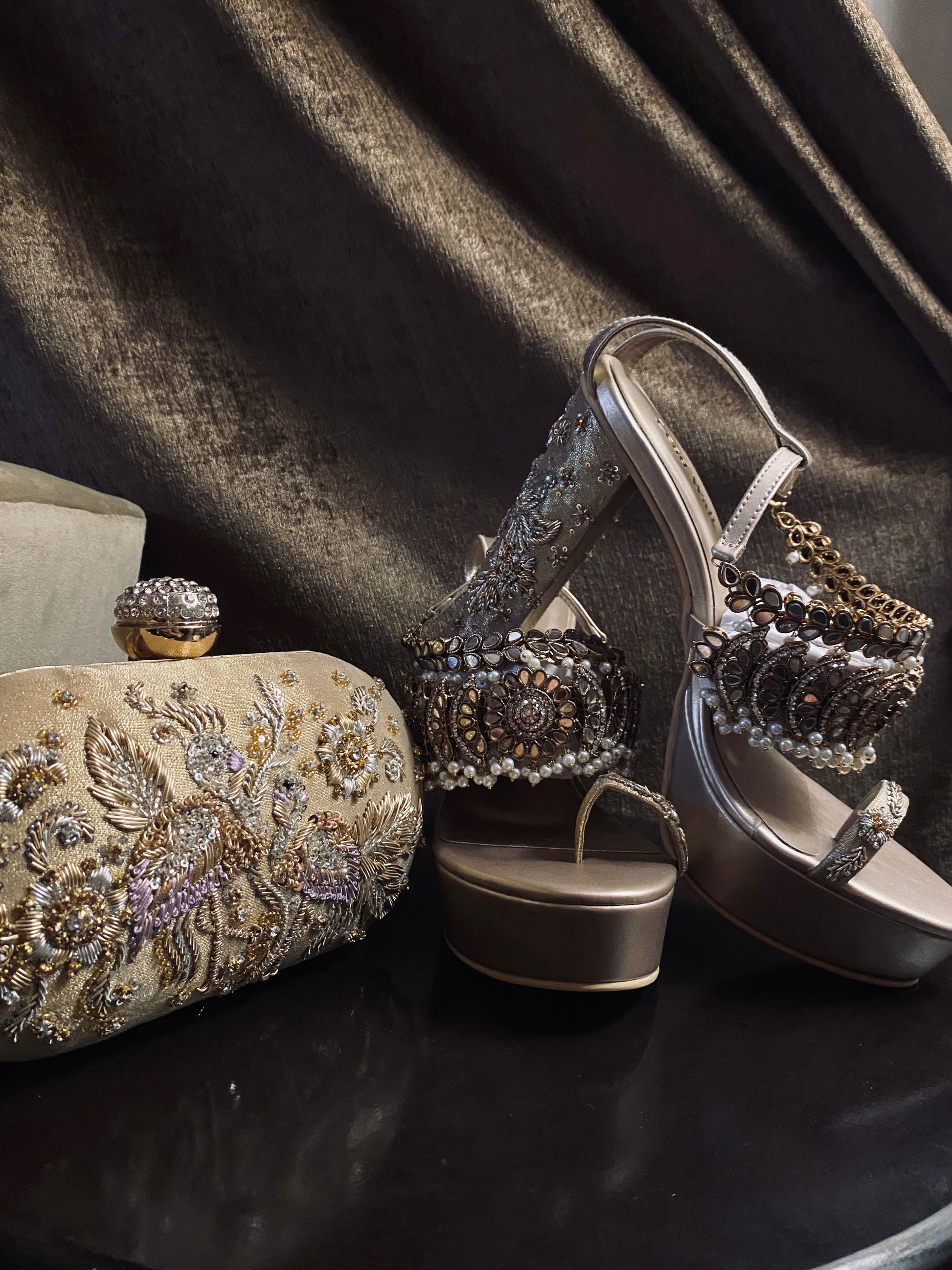 M A H W I ~ Ever saw the mixture of of Rajhastani vibes & modern fashion? A silhouette marking the dimensions out of the box! This client wanted something exceptional for her Valima ~ a match made in fictions, contemporary fashion details with the bold marks of Rajhistani jewels, keeping a kohlapuri heel in mind; we did true magic for her! & for the clutch, all eyes on it. Beauty with intricate hints of craftsmanship ✨